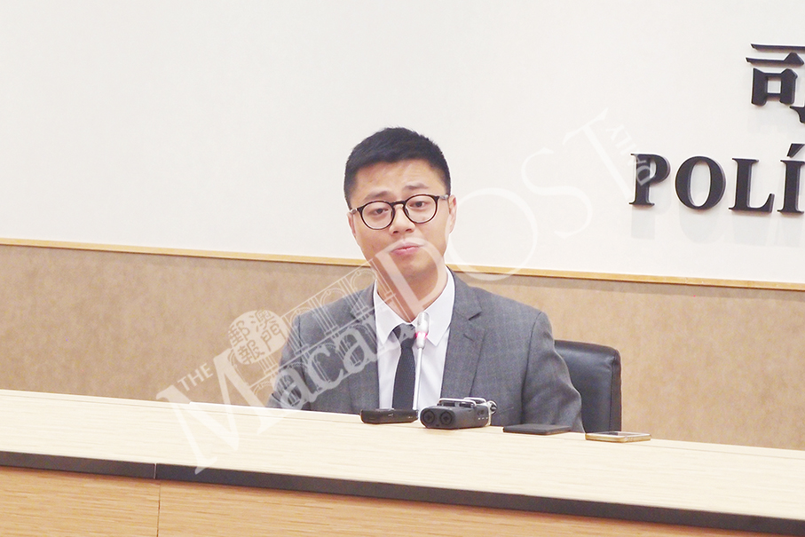 Judiciary Police (PJ) spokesman Leng Kam Lon listens to a reporter’s question during yesterday’s press conference at the PJ headquarters in Zape. Photo: Joel Chu