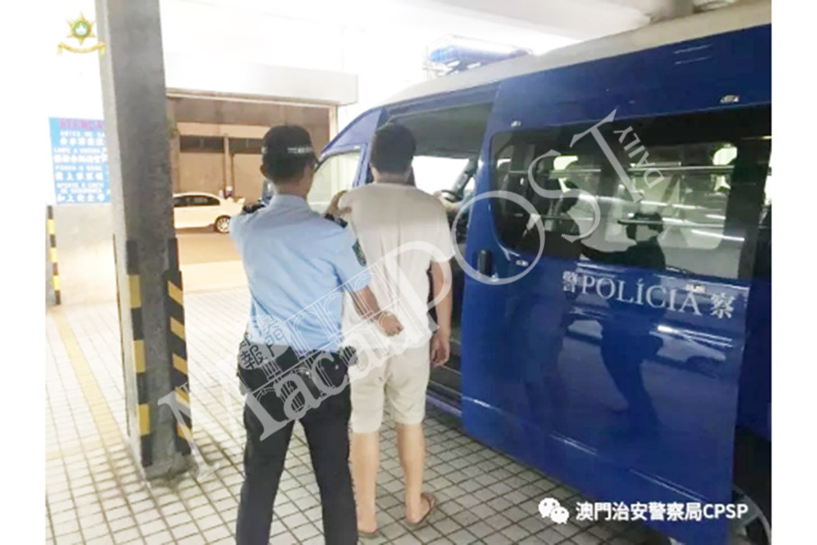 This undated handout photo released by the Public Security Police (PSP) yesterday shows a PSP officer escorting the rogue cabbie – a suspected blackmailer – to a PSP vehicle at a police station in Taipa.
