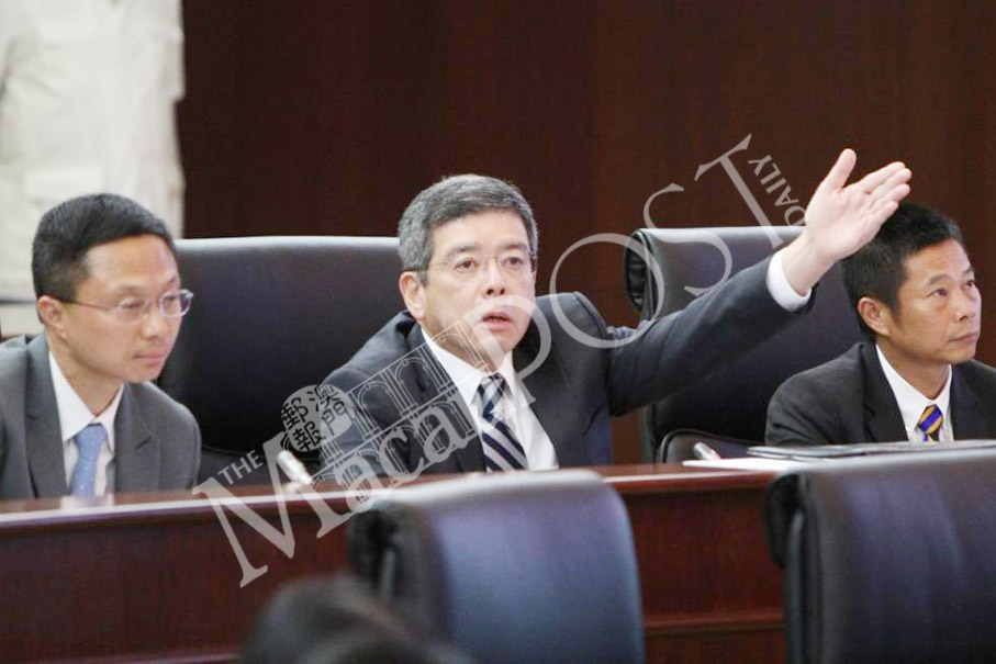 Secretary for Transport and Public Works Raimundo do Rosario (centre) gestures during yesterday’s plenary session in the legislature’s hemicycle, as Transport Bureau (DSAT) Director Kelvin Lam Hin San (left) and Lei Chong Man, acting chief of the Traffic Department of the Public Security Police (PSP), look on. Courtesy: TDM