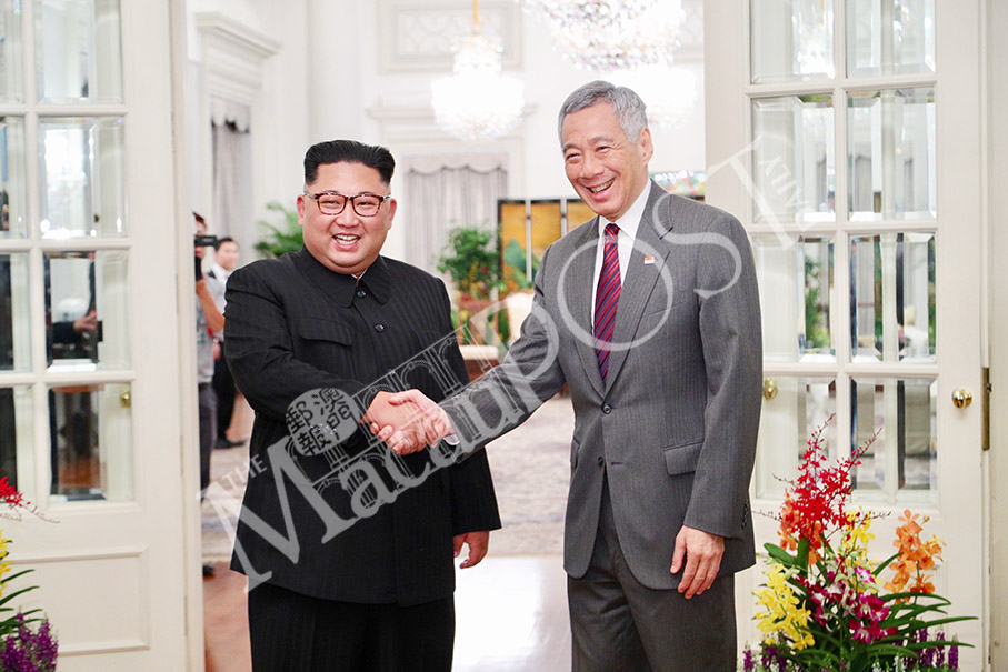 A handout photo taken by Ministry of Communications and Information of Singapore yesterday shows North Korea’s leader Kim Jong Un (left) shaking hands with Singapore’s Prime Minister Lee Hsien Loong (right) during his visit to The Istana, the official residence of the prime minister, following Kim’s arrival in Singapore. – AFP