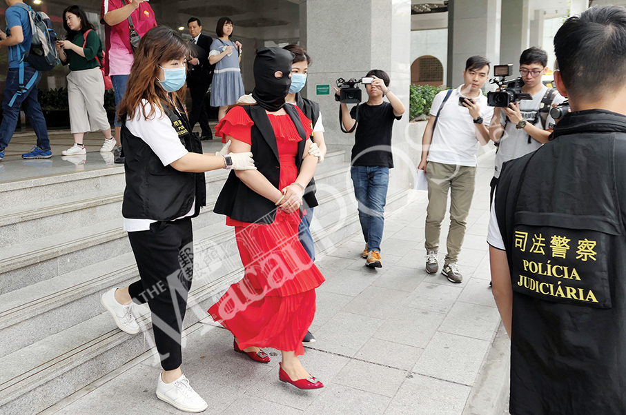 Judiciary Police (PJ) officers escort the female hooded theft suspect to a PJ vehicle outside the PJ headquarters in Zape yesterday. Photo: Iong Tat Choi
