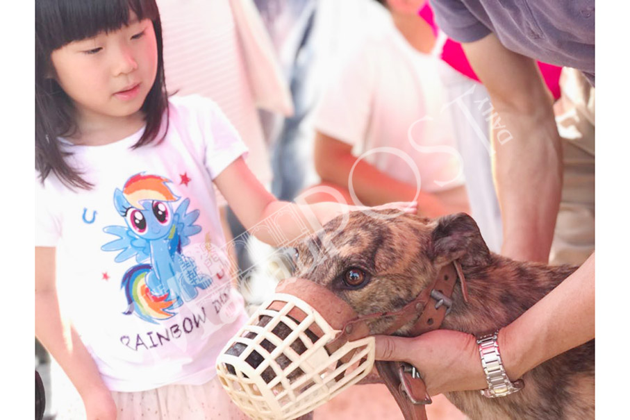 A girl pets a retired greyhound during an adoption day at the Macau (Yat Yuen) Canidrome in Fai Chi Kei yesterday. Photo: Maria Cheang Ut Meng