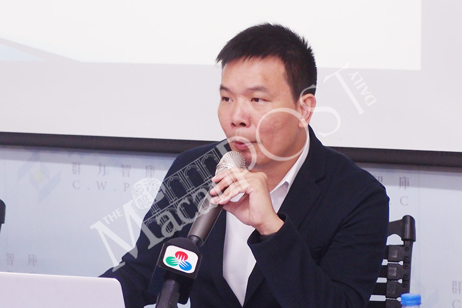 Collective Wisdom Policy Centre Vice President Chan Ka Leong addresses yesterday’s press conference held on the think tank’s premises in Avenida de Horta e Costa about the group’s study on combating drug-related crimes. Photo: Joel Chu