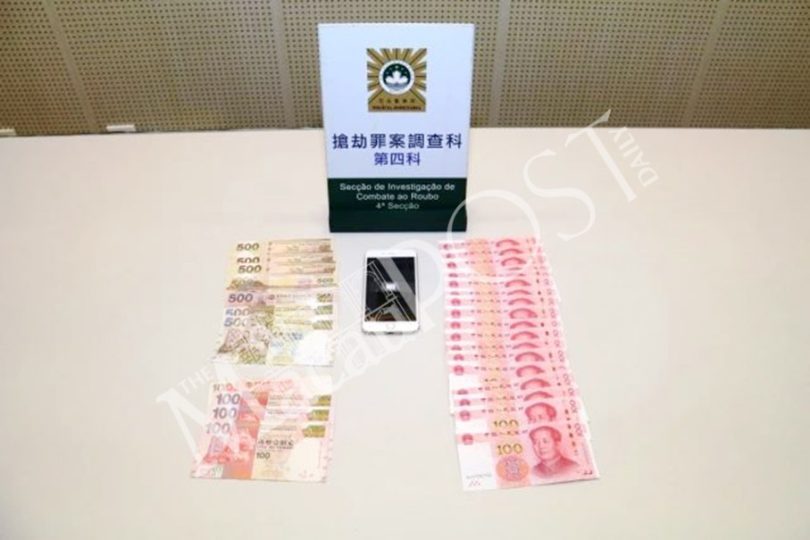 A mobile phone and cash in HK dollars and yuan seized from the suspected burglar are displayed in a pressroom of the Judiciary Police (PJ) headquarters yesterday. Photo: PJ