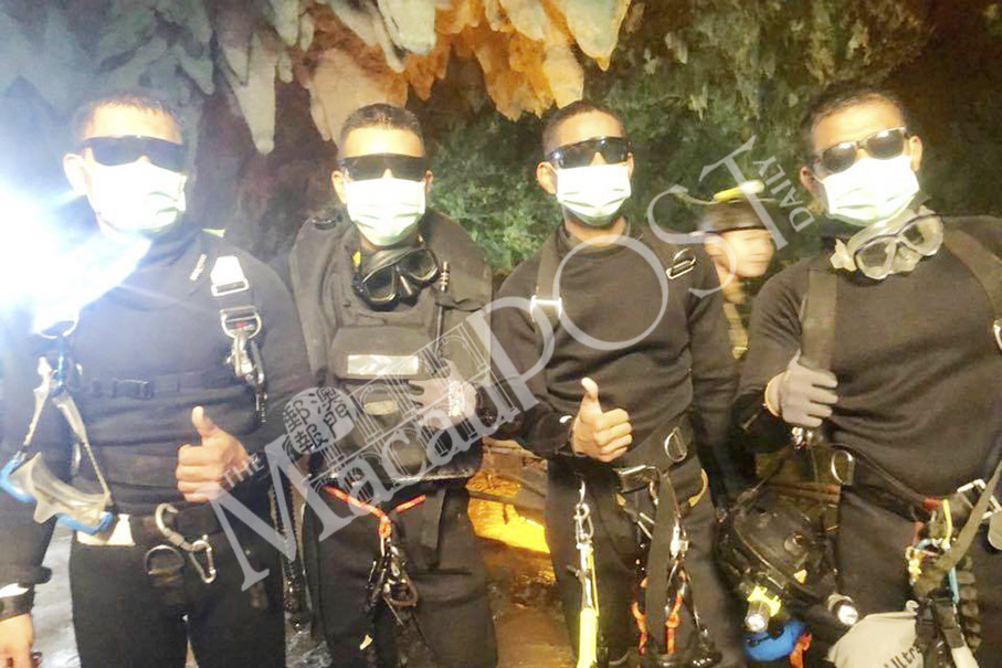 This handout photo released by the Royal Thai Navy yesterday shows the last four Thai Navy SEALs coming out safely after completing the rescue mission inside a cave where the 12 boys and their soccer coach were trapped since June 23, in Mae Sai, Chiang Rai province. – AP
