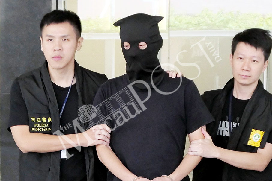Judiciary Police (PJ) officers escort the hooded theft suspect to a PJ vehicle outside the PJ headquarters in Zape yesterday. Photo: Iong Tat Choi