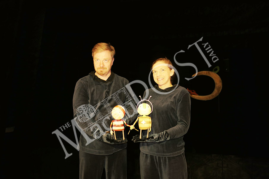 Performers Aapo Juhana Repo (left) and Neasa Padhraicín Ní Chuanaigh holding their puppet for “The Way Back Home” pose during yesterday’s media preview.