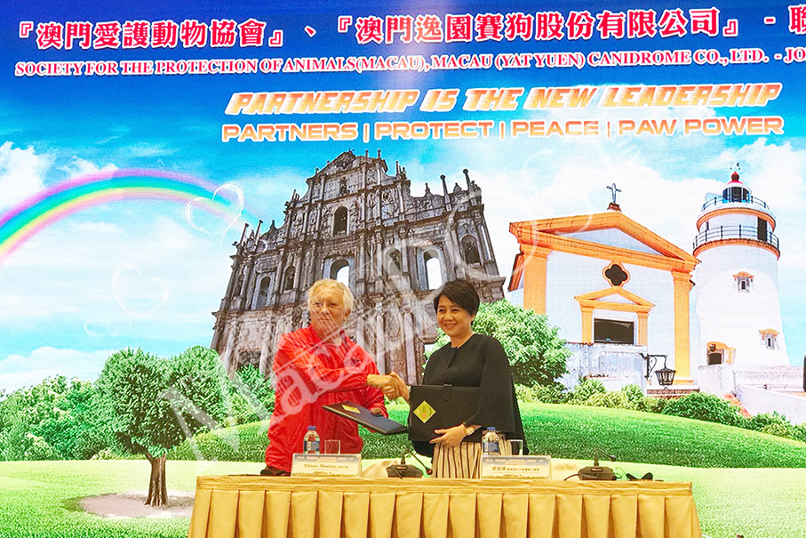 The operator of the city’s former greyhound racetrack – Macau (Yat Yuen) Canidrome Co. Ltd. – and local animal protection group Anima have inked a deal for the relocation of the racing dogs left behind at the Fai Chi Kei racetrack. Under the agreement, Yat Yuen will rent a vacant building in Pac On in Taipa for the setting-up of an international greyhound adoption centre – where the company plans to move the dogs left behind at the racetrack – which will then be operated by Anima.
