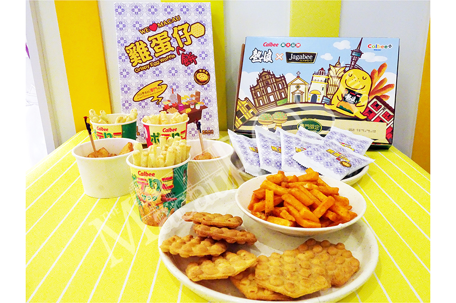 Poterico and potato hokkori (left), egg waffle biscuits in Portuguese egg tart flavour, and the hot and spicy flavoured potato sticks (right) are displayed at the Okashi Galleria x Calbee+ shop in Venetian last week.