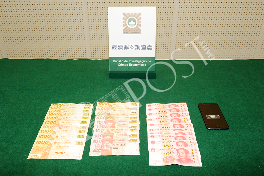 This undated handout photo provided by the Judiciary Police (PJ) yesterday shows evidence –cash and a mobile phone – seized from the Cambodia investment scam suspect from the mainland, displayed at a PJ pressroom.