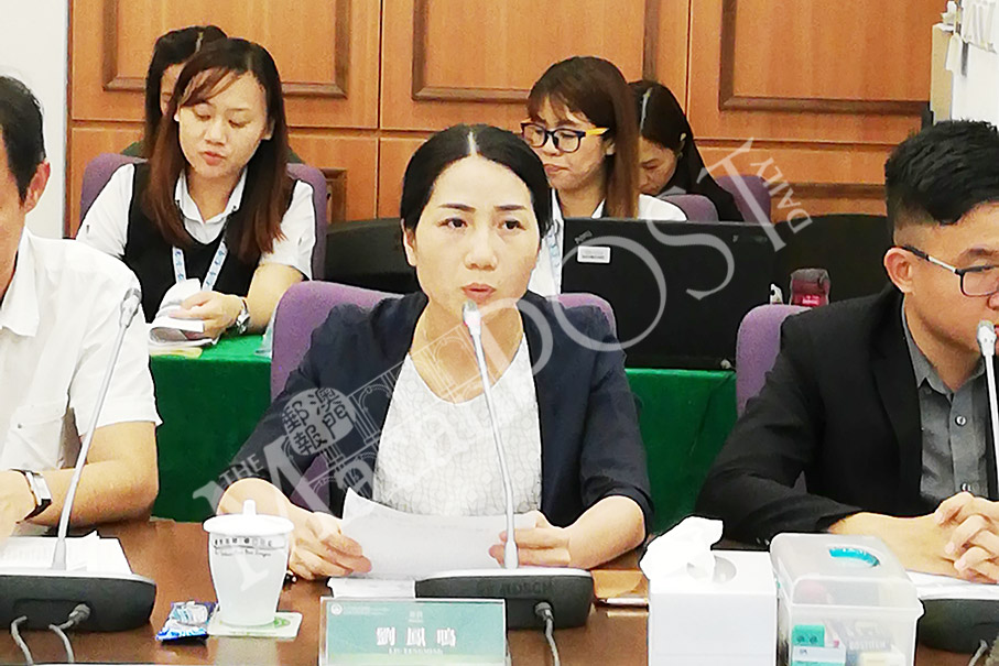 Liu Fengming, a member of the Taipa and Coloane Community Service Consultative Council, speaks during a monthly meeting of the government-appointed council at the Islands District Public Services Centre in Taipa yesterday. Photo: Kelvin Lam