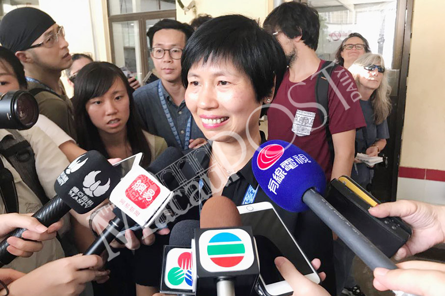 Civic and Municipal Affairs Bureau (IACM) Administrative Committee member Ung Sau Hong speaks to reporters during a media visit arranged by the bureau to the greyhound kennels at the now defunct Canidrome in Fai Chi Kei yesterday. Maria Cheang Ut Meng