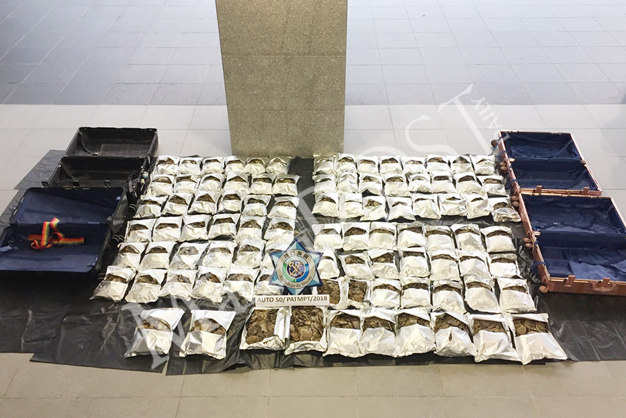 The statement said that in the evening of August 30, custom officers stationed there stopped a female Hong Kong resident in her fifties – who was about to enter Macau carrying four suitcases. During a search of her luggage, the customs found about 100 kilogrammes of suspected pangolin scales – which were wrapped in over 90 tin foil packets.