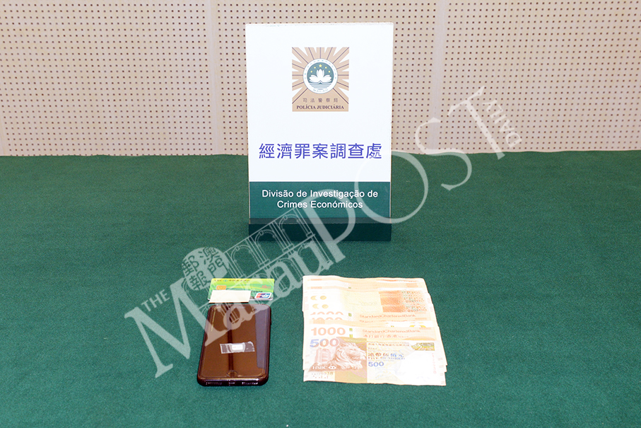 This undated handout photo provided by the Judiciary Police (PJ) yesterday shows items – a smartphone, a bank card, and cash – seized from the suspect.