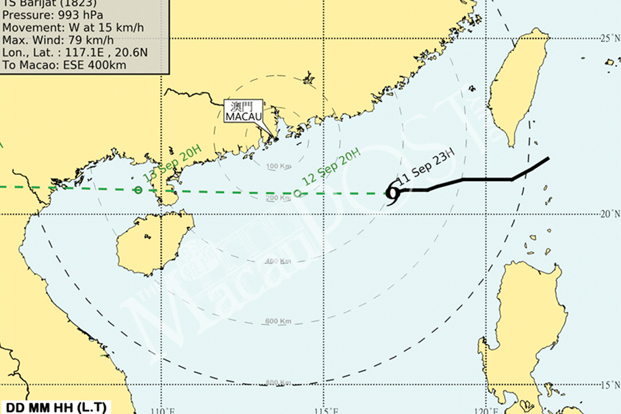The weather station hoisted the No. 1 signal at 11 a.m. yesterday and as of 11 p.m. last night, Barijat was located 400 kilometres east-southeast of Macau and was forecast to move west at around 15km/h.