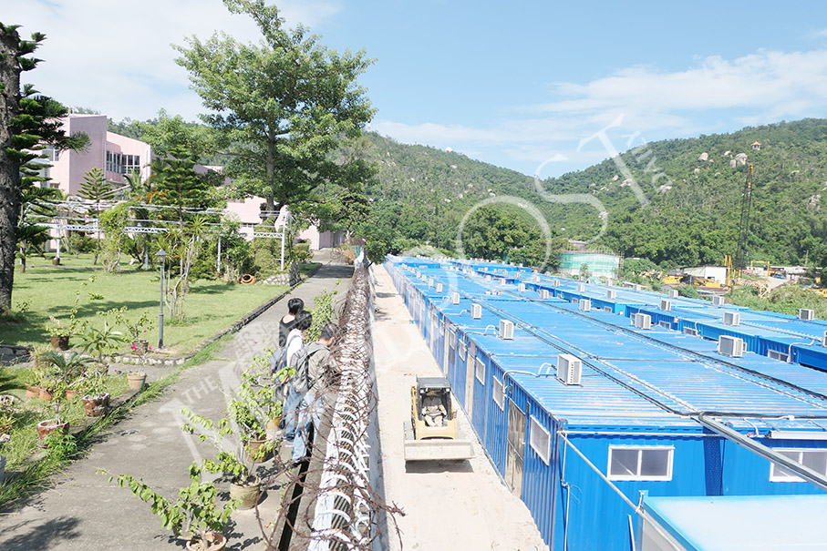 This photo taken yesterday shows several dozen shipping containers (right) to be used as kennels installed in proximity to old people’s dormitories (pink building on left) at the Asilo Vila Madalena retirement home in Coloane.
