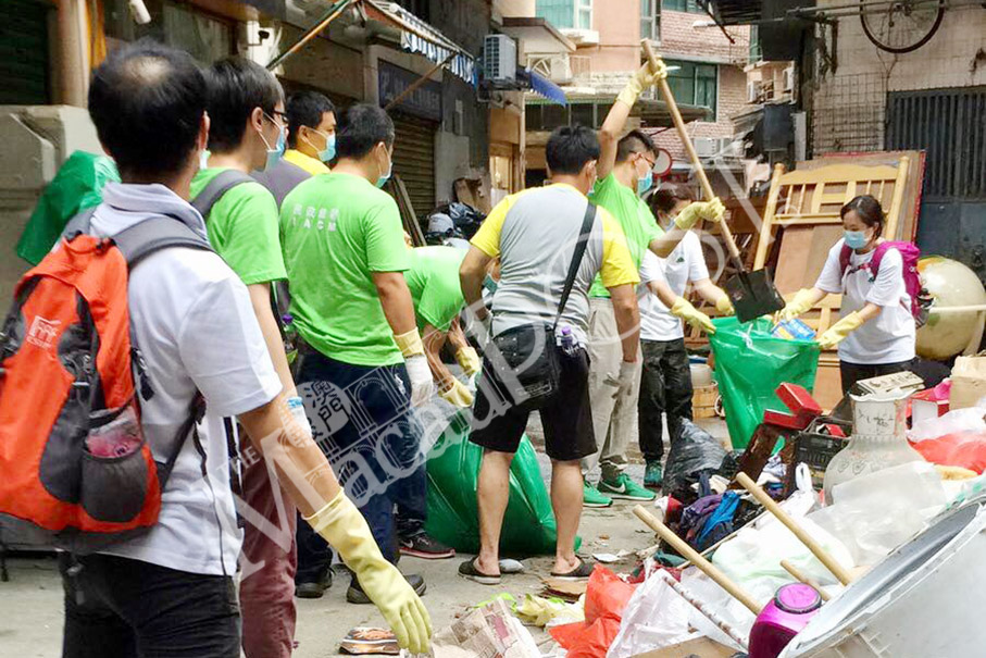Volunteers organised by the Civic and Municipal Affairs Bureau (IACM) yesterday remove rubbish in the Inner Harbour area resulting from severe flooding caused by a storm surge during Sunday’s Mangkhut onslaught. Photo: IACM