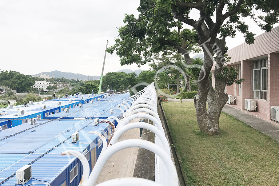 This photo taken last week shows shipping containers (left) installed on a plot of land right next to the dormitories (right) for frail residents of the private Asilo Vila Madalena retirement home. The about 100 air-conditioned containers are to be used as temporary kennels for over 500 greyhounds awaiting adoption, four dogs per container, according to Macau (Yat Yuen) Canidrome Co. Ltd. staff members. Photos: Monica Leong