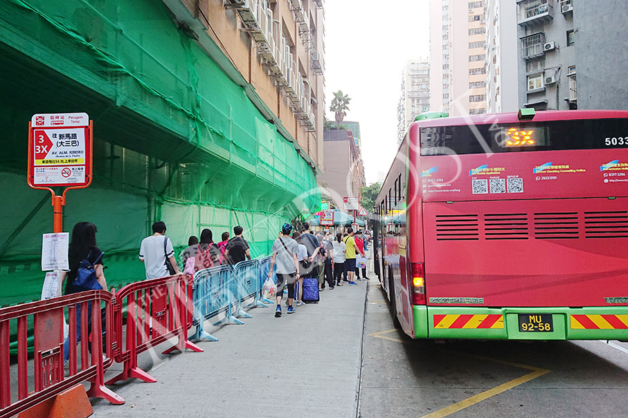 Passengers yesterday get on a 3X Route bus at a bus stop in Istmo de Ferreira do Amaral near the Barrier Gate border checkpoint. The bus stop serves as the temporary “terminal” station for bus routes 3 and 3X, which are among the 24 bus routes that were rerouted to other locations as their provisional “terminal” station after the Barrier Gate underground bus terminal went out of operation following the onslaught of Super Typhoon Hato on August 23 last year. Photo: Tony Wong