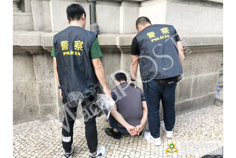 This handout photo provided by the Public Security Police (PSP) yesterday shows officers holding the pickpocket suspect near the General Post Office in Avenida de Almeida Ribeiro on Tuesday afternoon.