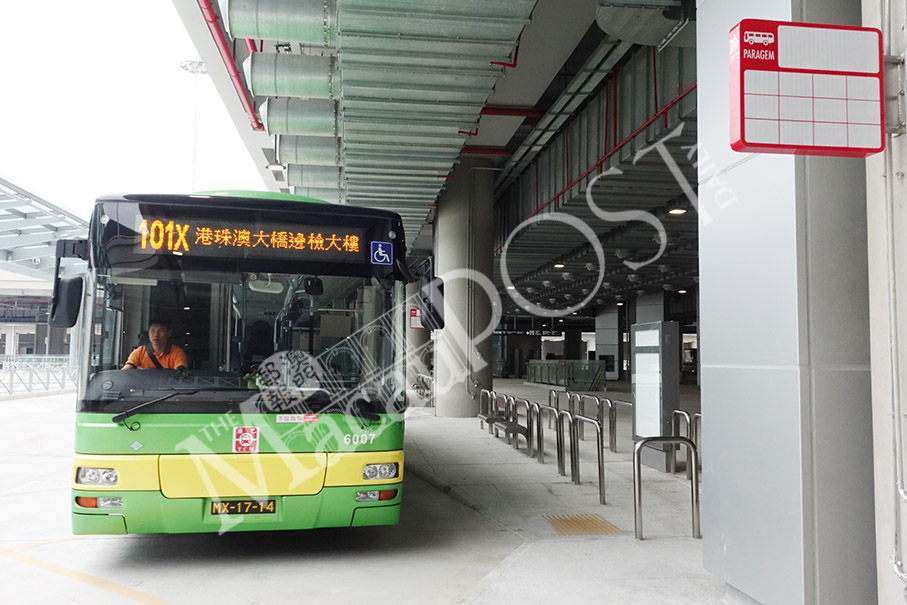 This undated handout photo released by the Transport Bureau (DSAT) yesterday shows a TCM public bus for route 101X at the Macau Border Checkpoint Management Area of the Hong Kong-Zhuhai-Macau Bridge (HZMB). The route will travel between the HKZM checkpoint and the Macau peninsula. A bus ride from the peninsula or Taipa (102X) costs 6 patacas for cash-paying passengers. For MacauPass holders, the ride costs 4 patacas.