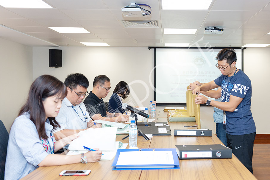 Infrastructure Development Office (GDI) officials unseal the 14 bids submitted by construction companies build a flyover in front of the Taipa Ferry Terminal connecting Estrada de Pac On with the land reclamation area known as Zone E2, at the office in Zape yesterday. Photo: GCS