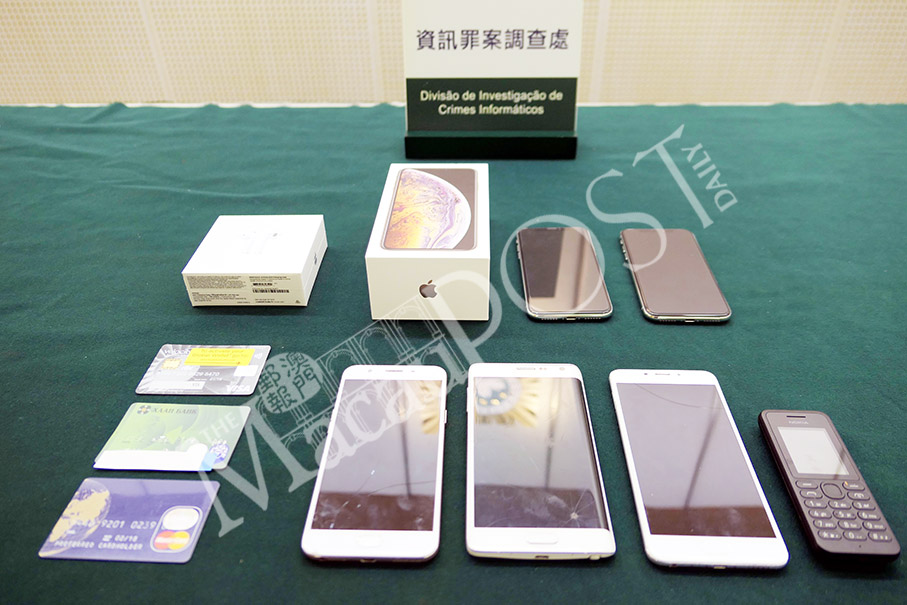 Mobile phones and credit cards seized from the two Mongolian suspects on Tuesday are displayed at a pressroom of the Judiciary Police (PJ) yesterday. Photo: Iong Tat Choi