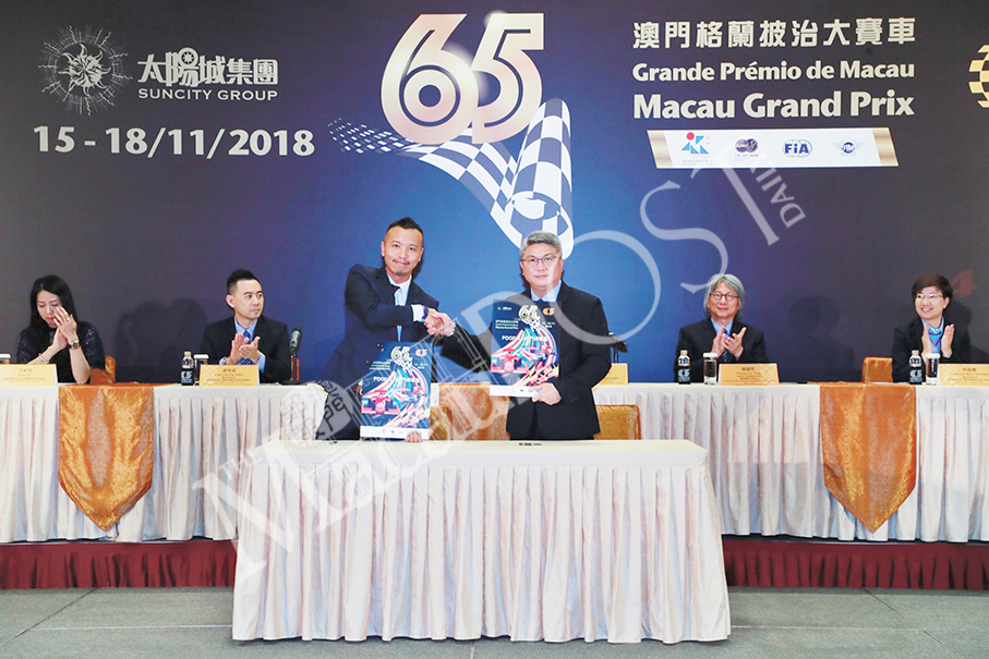 Food4U CEO Lei Weng Fai (left) and Sports Bureau President Pun Weng Kun shake hands during a recent ceremony for the 65th Macau Grand Prix. Photo: Food4U