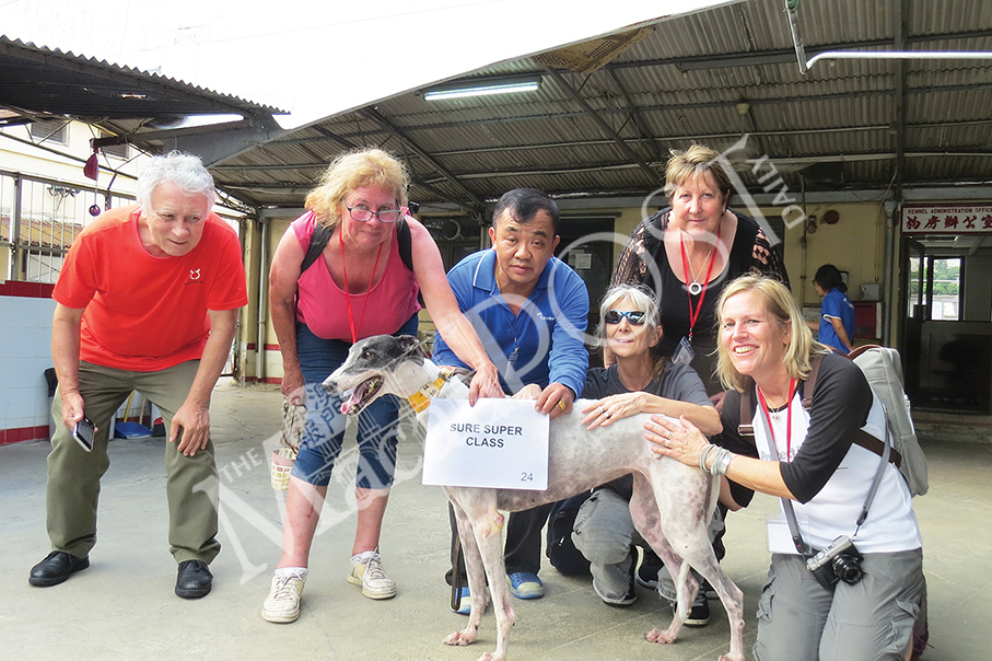 (Left to right) Albano Martins, Cathy Brown, a handler, Lesley Wells, Helen Lauricella and Robin Reich pose with Sure Super Class before she leaves for Hong Kong on her way to Philadelphia at the Canidrome on Wednesday.