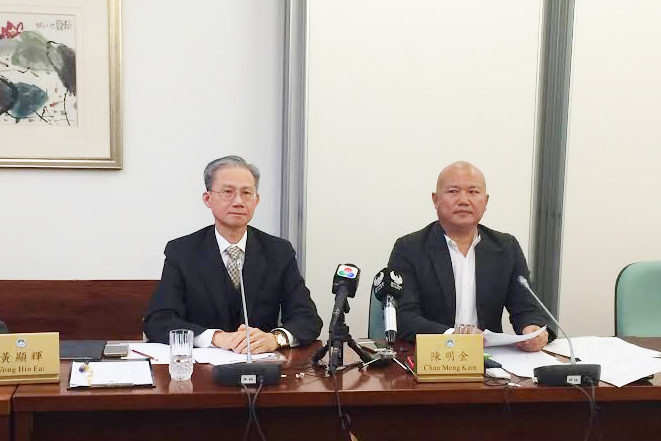 Legislator-cum-businessman Chan Meng Kam (right), who chairs the legislature’s Follow-up Committee for Public Administration Affairs, and lawmaker-cum-lawyer Vong Hin Fai, secretary of the committee, pose before briefing reporters about yesterday’s committee meeting. Photo: MPDG