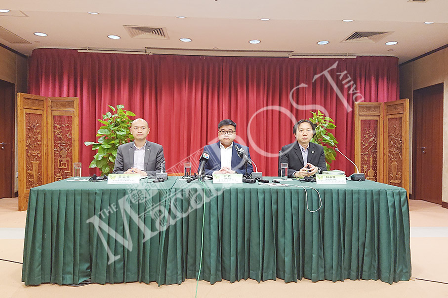 Kong Ngai (centre), who heads the Education Department of the Education and Youth Affairs Bureau (DSEJ), chairs yesterday’s special press conference about the children’s sexual abuse case, accompanied by Wong Chi Iong (left), who heads the bureau’s Continuing Education Division and Ho Weng Kong, a DSEJ senior public servant tasked with legal affairs, at the bureau in Nam Van. Photo: Tony Wong