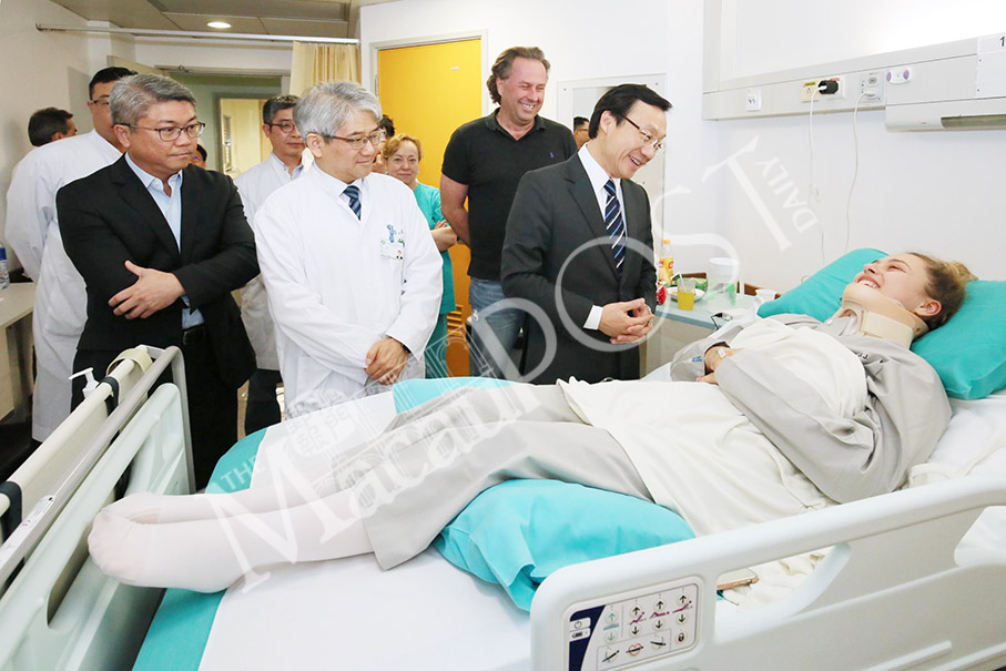 Secretary for Social Affairs and Culture Alexis Tam Chon Weng (right, front), Sports Bureau (ID) President Pun Weng Kun (left, front) and Health Bureau (SSM) Director Lei Chin Ion (centre, front) visit Germany’s F3 driver Sophia Flörsch at the government-run Conde de S. Januario Hospital Centre yesterday, accompanied by other officials and members of Flörsch’s team. Photo: GCS