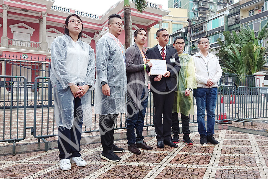 One of the organisers of the “Wage Earners Alliance”, Ng Kim Ip (third from left), hands a petition against the government’s new mandatory holiday arrangement proposal to an official (third from right) outside Government Headquarters yesterday, as lawmakers-cum-unionists Ella Lei Cheng I (first from left) and Leong Sun Iok (first from right) and Ng’s fellow organisers look on.
