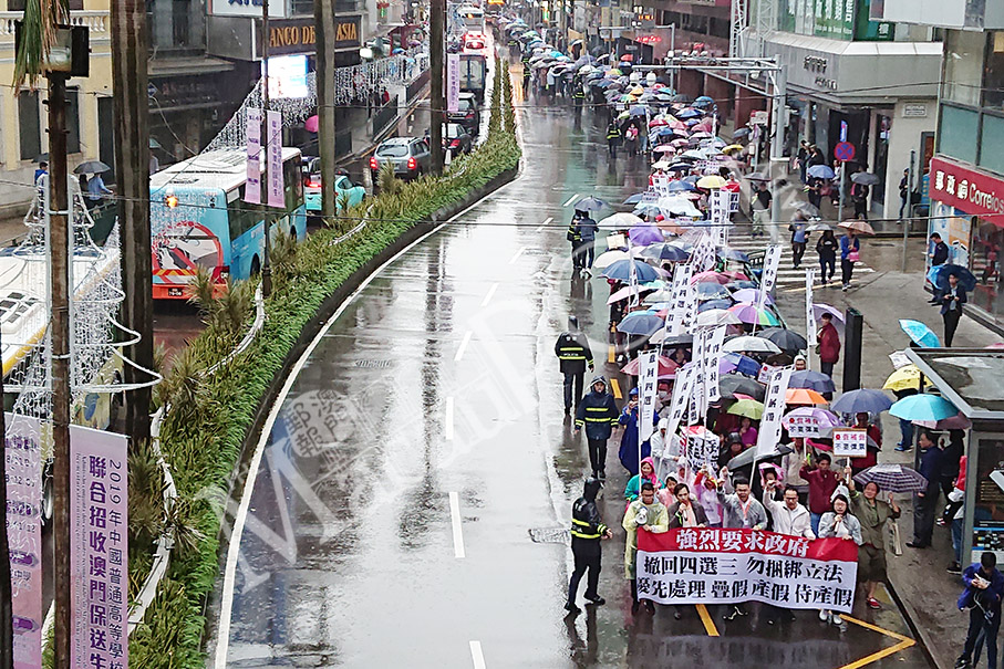 Protestors march in Rua do Campo during yesterday’s demonstration against the government’s “Choose 3 among 4” proposal. Photos: Tony Wong