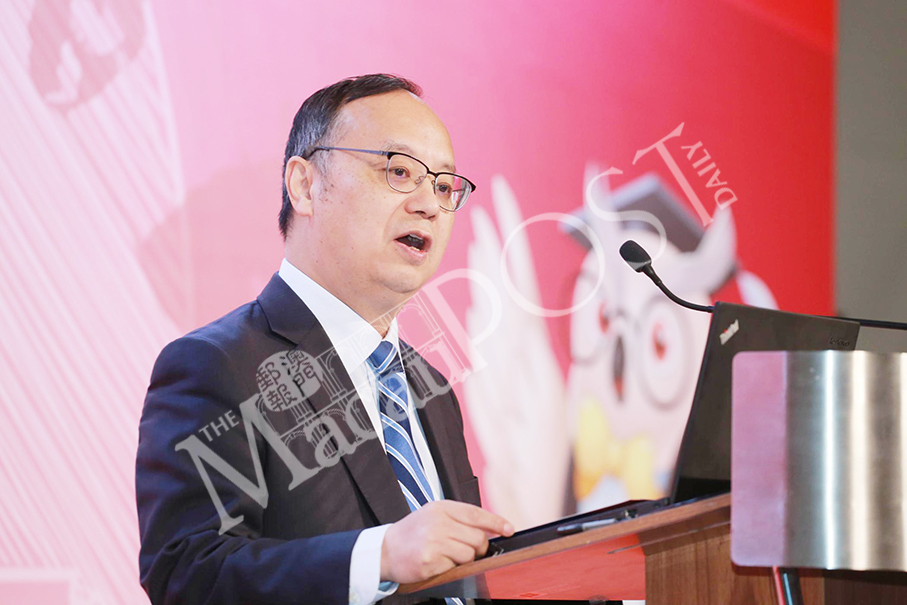 University of Macau (UM) Rector Song Yonghua delivers a speech during yesterday’s on-campus Responsible Gambling Symposium 2018 hosted by the public university’s Institute for the Study of Commercial Gaming (ISCG). Photo: UM