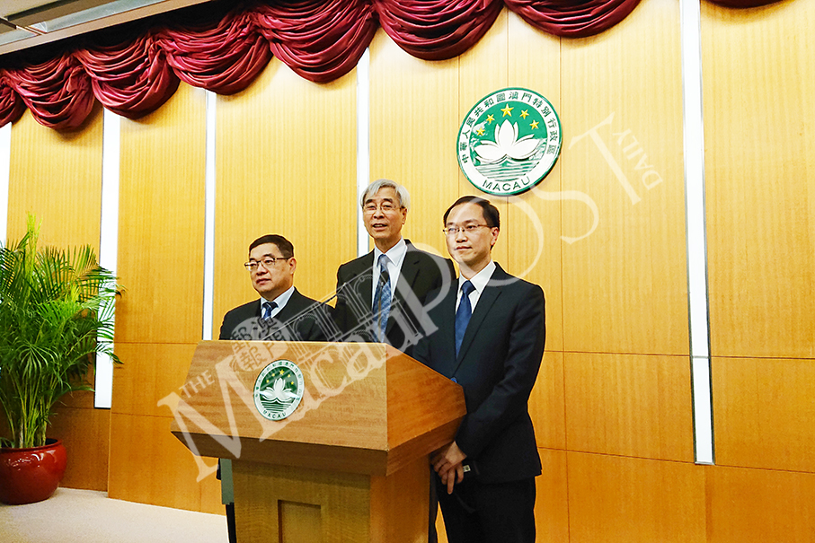 Executive Council spokesman Leong Heng Teng (centre), Public Administration and Civil Service Bureau (SAFP) Director Kou Peng Kuan (right) and his deputy Chou Kam Chon address yesterday’s press conference about the government’s e-services by-law, at Government Headquarters. Photo: Tony Wong