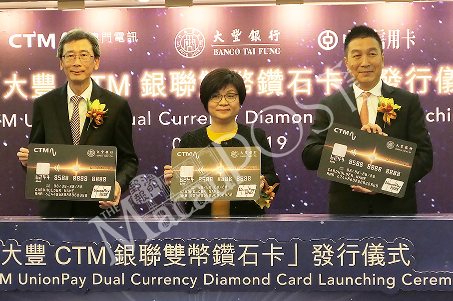 A launch ceremony of the new card was held at Tai Fung Bank Headquarters Building in Nape yesterday, attended by the bank’s vice president Ao Ieong Iu Kong, the city’s Post and Telecommunications Bureau (CTT) Director Derby Lau Wai Meng and CTM CEO Vandy Poon Fuk Hei.