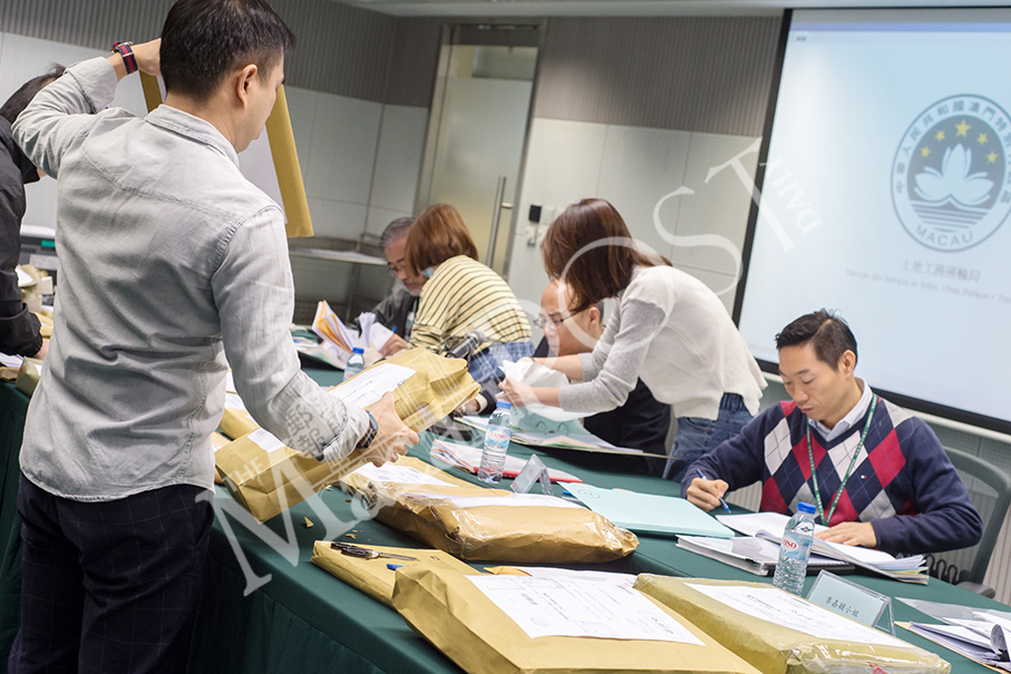 Lands, Public Works and Transport Bureau (DSSOPT) officials unseal the 20 bids submitted by construction companies for the repair project for the Gate of Understanding, at the Transport Bureau (DSAT) Building yesterday. Photo: GCS