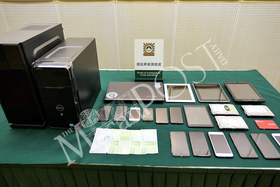 Evidence seized from the stolen card info online purchase case, including a laptop, desktops, tablets and mobile phones, are displayed in a pressroom of the Judiciary Police (PJ) headquarters in Zape yesterday. Photos: Iong Tat Choi