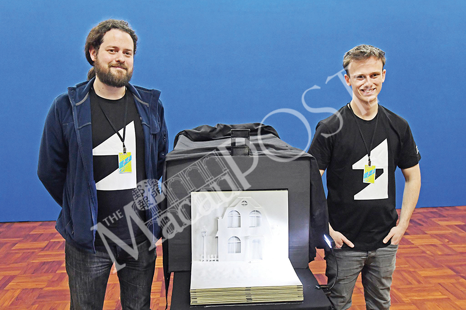 Artists Andrew Quinn (left) and Edward Grimoldby pose with The Icebook during a media preview in Ngai Chon Centre in Fai Chi Kei district yesterday. Photos: Cultural Affairs Bureau