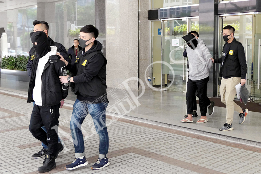 Judiciary Police (PJ) officers escort the hooded drug-trafficking suspect (front) from Hong Kong and hooded local drug user to a PJ vehicle outside the PJ headquarters in Zape yesterday. Photo: Iong Tat Choi