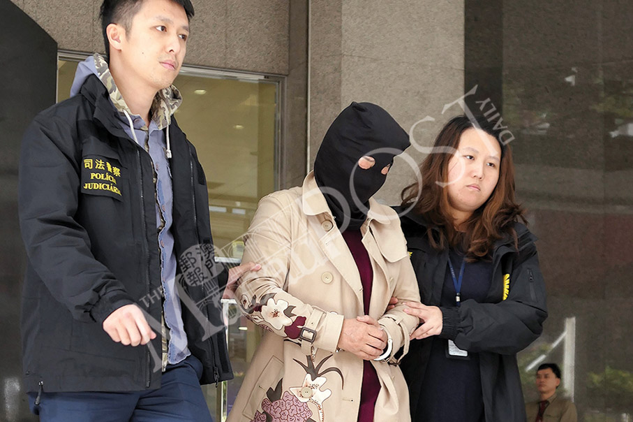 Judiciary Police (PJ) officers escort the hooded fraud suspect to a PJ vehicle outside the PJ headquarters in Zape yesterday. Photos: Iong Tat Choi