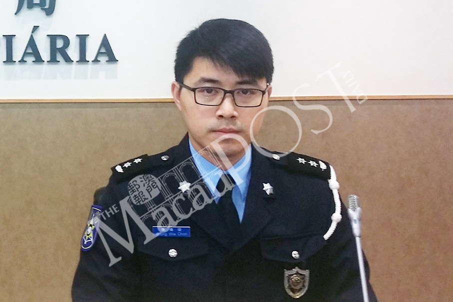 Public Police Security (PSP) spokesman Wong Wai Chon poses during yesterday’s regular press conference. Photo: Kristy Chan
