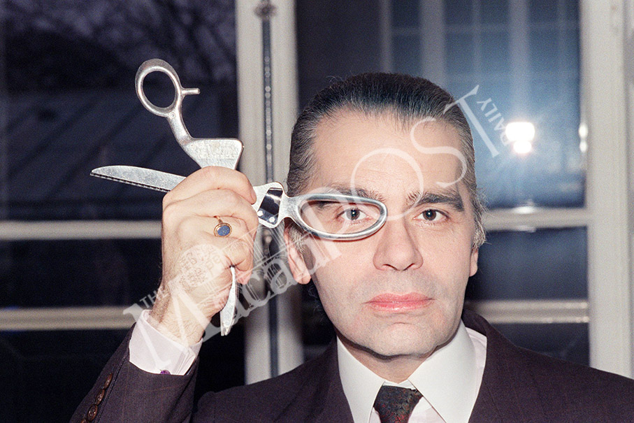 This photo taken in March 1987 shows German designer Karl Lagerfeld posing with scissors in his fashion studio in Paris. – AFP