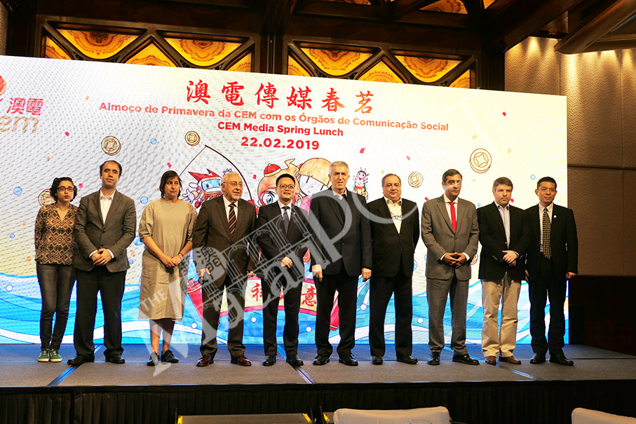 CEM Executive Committee Chairman Bernie Leong Wa Kun (fifth from left), and CEM Principal Advisor to the Executive Committee Benjamin Yue Zongbin (right) pose with English- and Portuguese-language media representatives during Friday’s CEM Media Spring Lunch at MGM Macau. Photo: Monica Leong