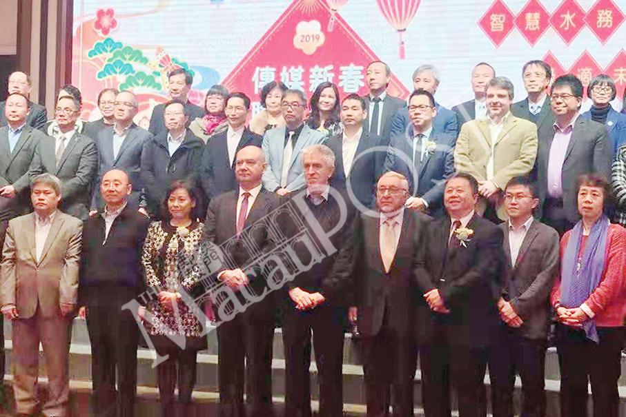 Macao Water Executive Director Nacky Kuan Sio Peng (third from left) and Deputy General Manager Oscar Chu Wai Man (third from right) pose with Macau media representatives during yesterday’s Media Spring Luncheon at the Macau Tower Convention and Entertainment Centre. Photo: Maria Cheang Ut Meng