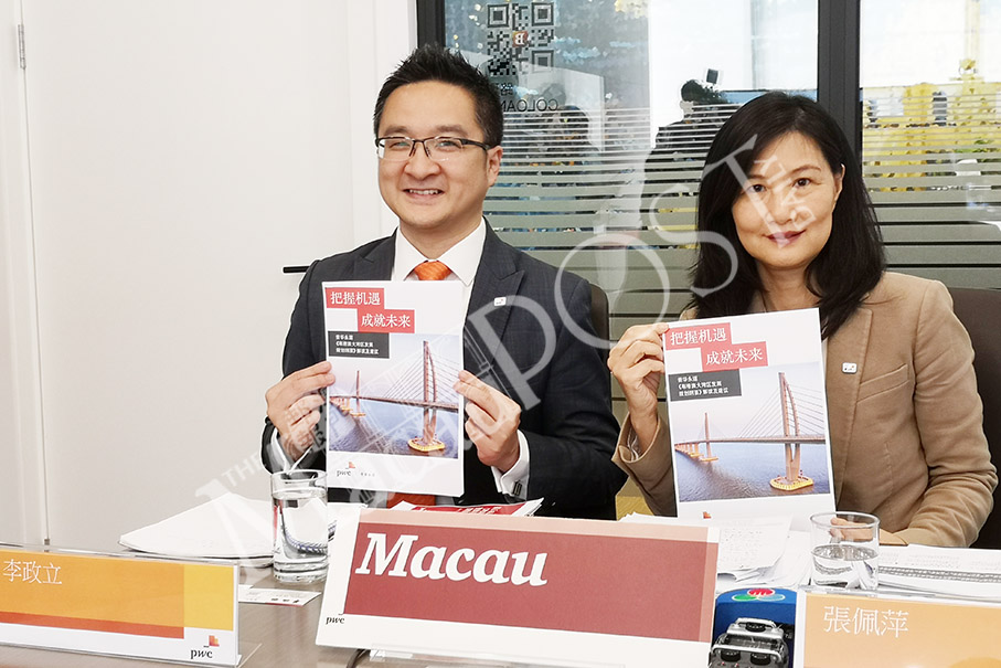 PwC Macau Office Lead Partner Grace Cheung Pui Peng (right) and Assurance Director Bernard Li Zhinong pose with copies of their company’s GBA report during a video conference with PwC branch representatives from Guangzhou, Shenzhen and Hong Kong, at the PwC Macau office at the Finance and IT Centre in Nam Van yesterday. Photo: Edwin Yang