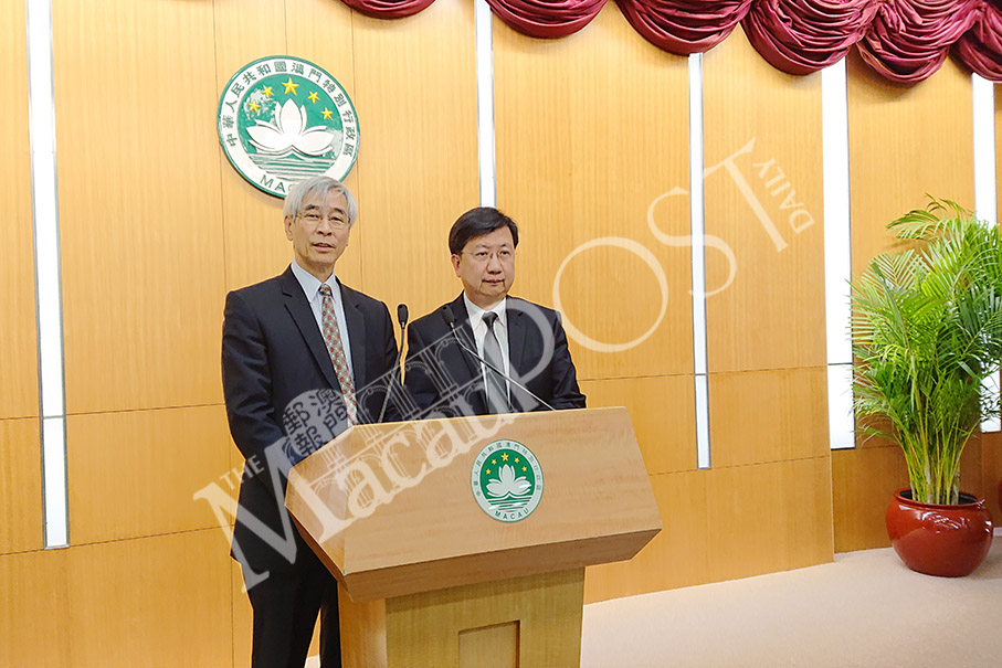 Executive Council spokesman Leong Heng Teng (left) and Environmental Protection Bureau (DSPA) Director Raymond Tam Vai Man address yesterday’s press conference at Government Headquarters about the government’s proposed plastic carrier bag charge scheme bill. Photo: Tony Wong
