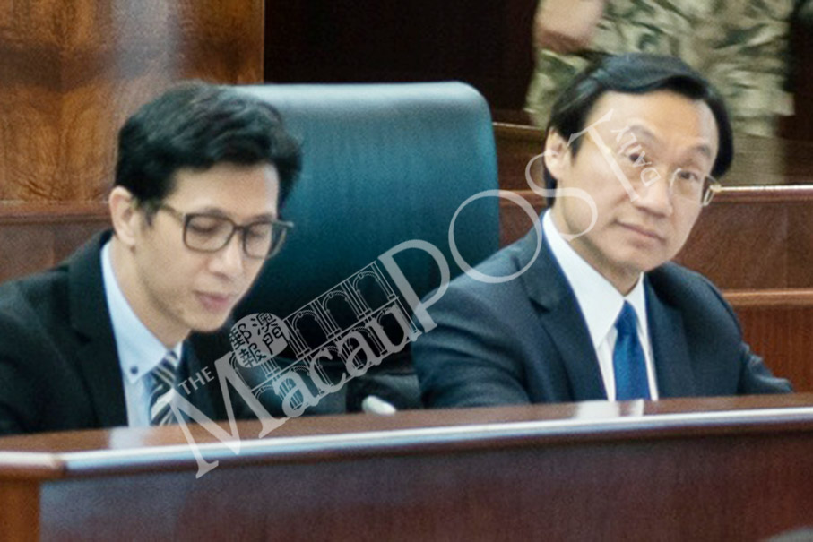 Secretary for Social Affairs and Culture Alexis Tam Chon Weng (right) and Social Welfare Bureau (IAS) Vice President Hon Wai attend yesterday’s plenary session in the legislature’s hemicycle. Photo: GCS