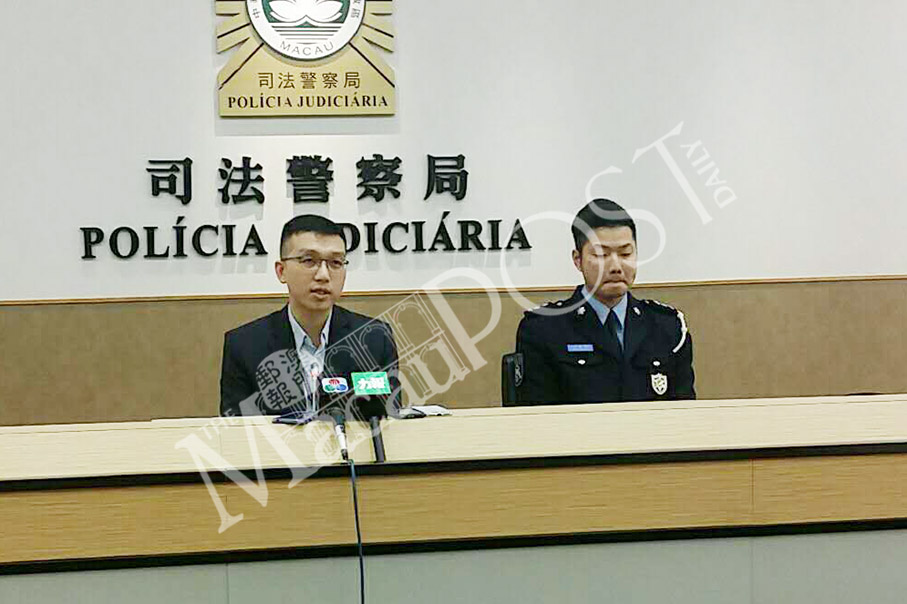 Judiciary Police (PJ) spokeswoman Choi Ian Fai (left) answers journalists’ questions as Public Security Police (PSP) spokesman Kam Ka Kit looks on, during yesterday’s regular press conference by Macau’s two police forces. Photo: Kristy Chan